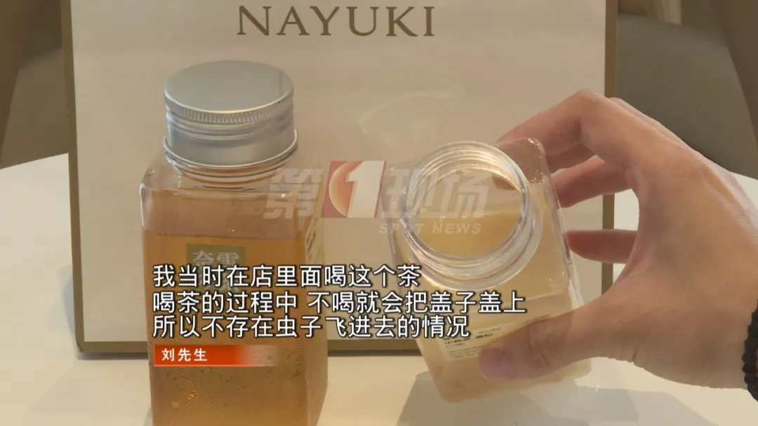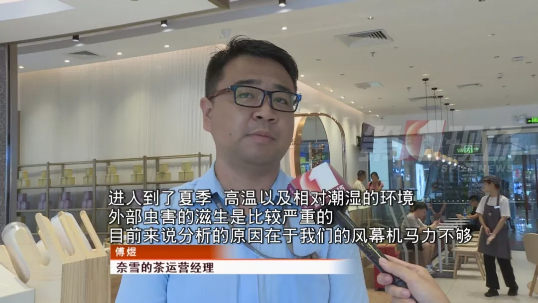 今天早上,记者陪同刘先生来到这家奈雪门店。工作人员表示,事发后,他们调取了监控进行研判,暂时还不能确定飞虫是在哪个环节进到杯子中的。不过,经过初步排查,最有可能与餐厅的环境以及风幕机的老化有关。