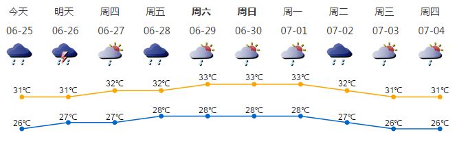 我市多云间阴天,有阵雨或雷阵雨,部分时间雨势较大;气温25-31℃;西南风2-3级;相对湿度75%-95%