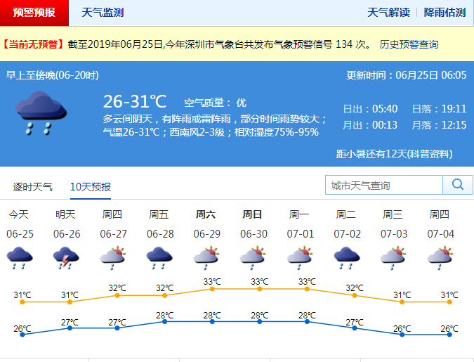 深圳新闻网2019年6月25日讯 昨日,深圳启动暴雨IV级应急响应,全市普遍出现大雨,局部暴雨,最高气温26℃左右,高温天气缓解。市气象台预测,未来两天风力清劲,多阵雨,局部大雨。