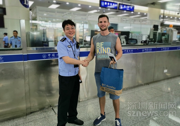 包括失而复得,乌克兰旅客与福田口岸边检站民警握手致谢(福田口岸供图)
