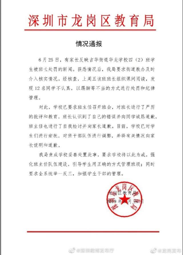 龙岗区教育局同时表示,将责成学校妥善处理,要求学校以此为戒,强化班主任队伍建设,引导学生用正确的方式管理班级;同时要求全系统举一反三,加强学生干部的管理。