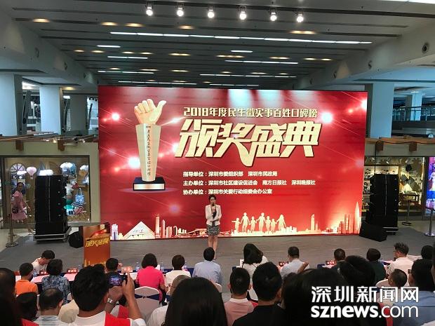 2018年民生微实事百姓口碑榜评选及颁奖活动由深圳市委组织部、深圳市民政局指导,深圳市社区建设促进会、南方日报社、深圳晚报社共同主办,深圳市关爱行动组委会办公室协办。经历1个多月时间,通过项目申报、网络投票、专家评审等环节,最终评选出“共六大类奖项。整个评选经过项目征集、网上投票和评委打分等过程产生。