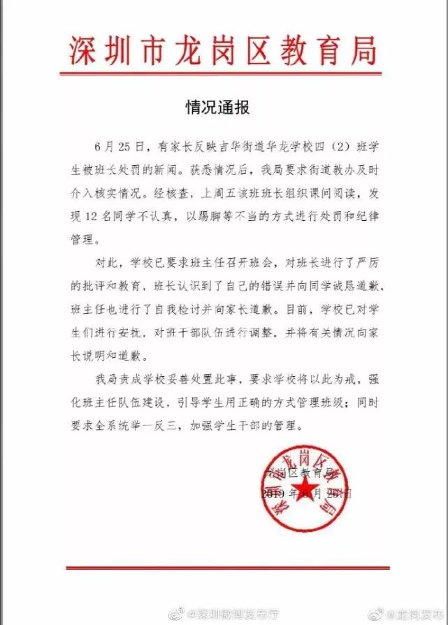 ⑤有家长反映深圳一学校“30多名小学生排队挨班长打”,教育局通报,学校已对班长进行严厉批评教育,班主任进行了自我检讨并向家长道歉。
