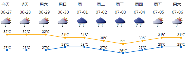 我市多云,有阵雨或雷阵雨,局部大雨;气温27-32℃;西南风2-3级;相对湿度70%-95%