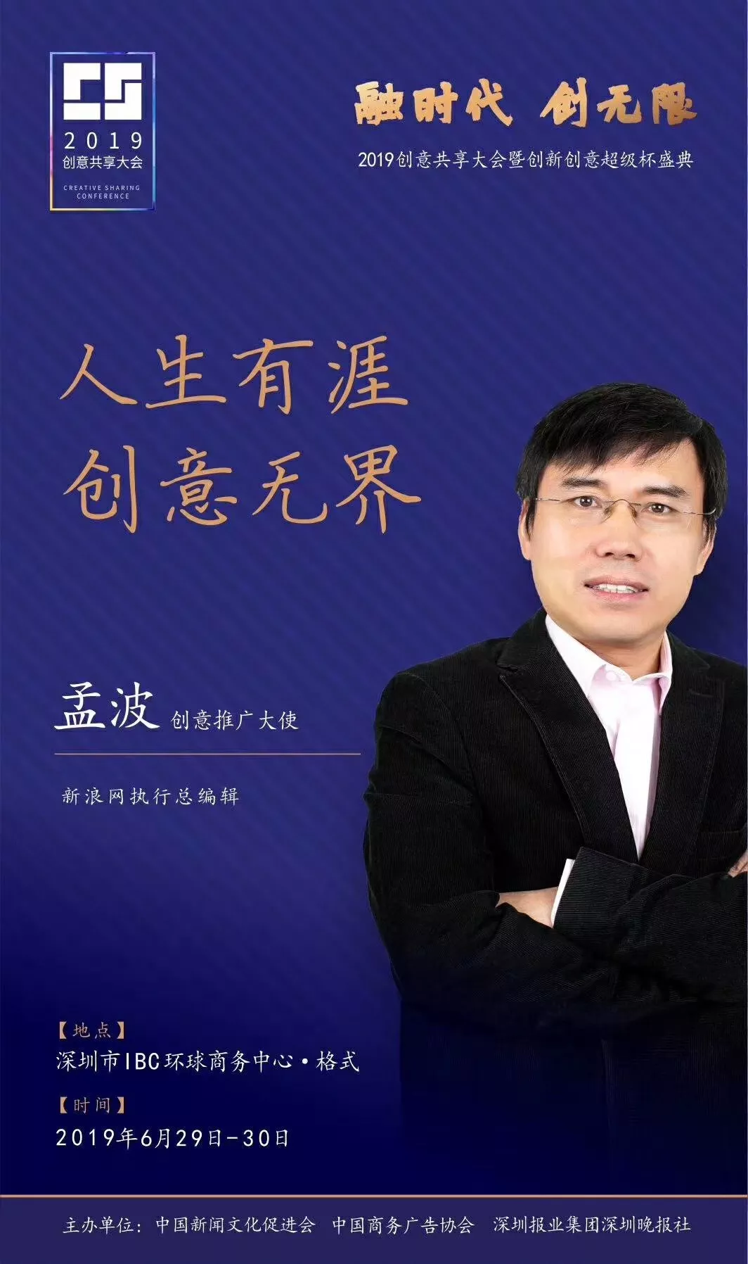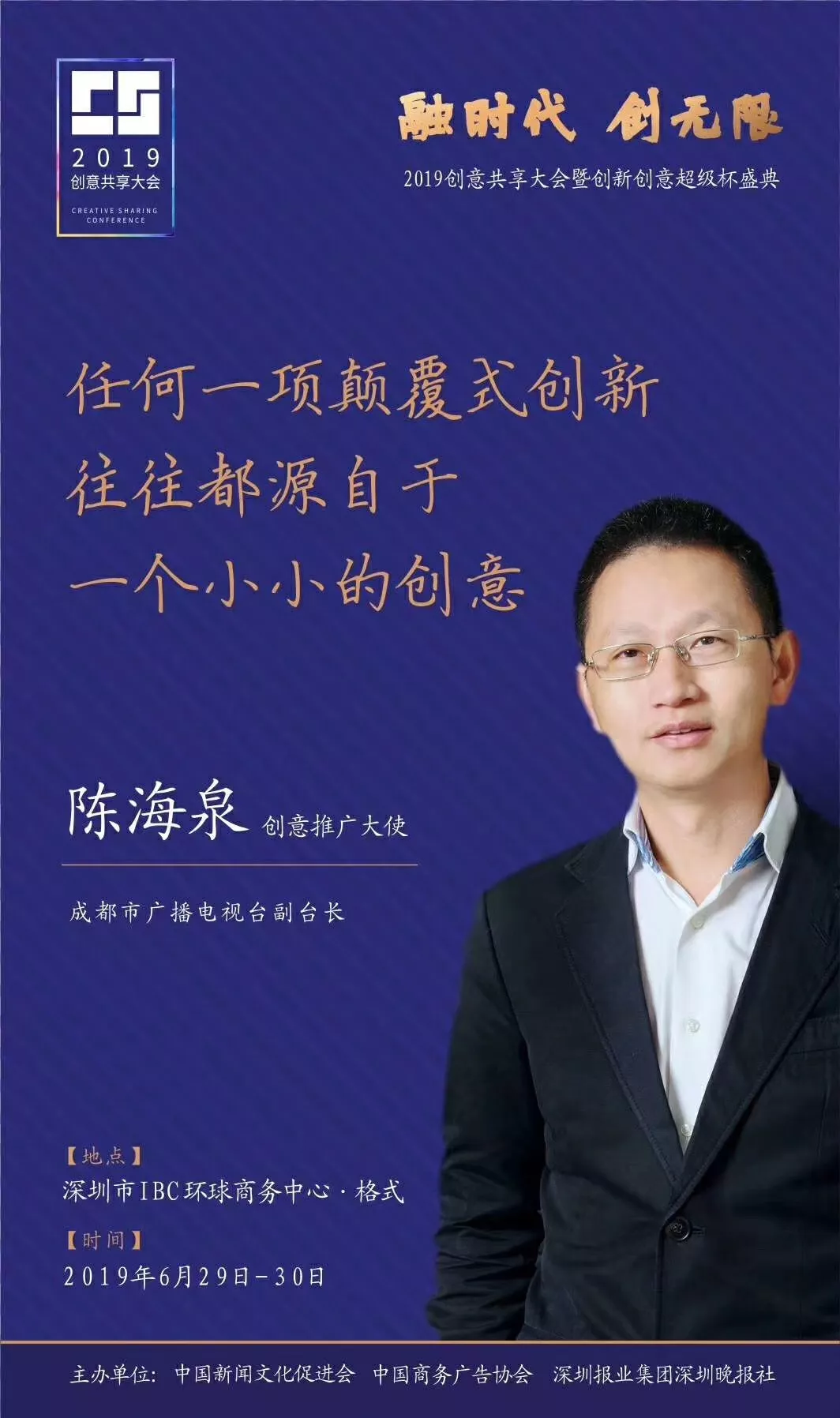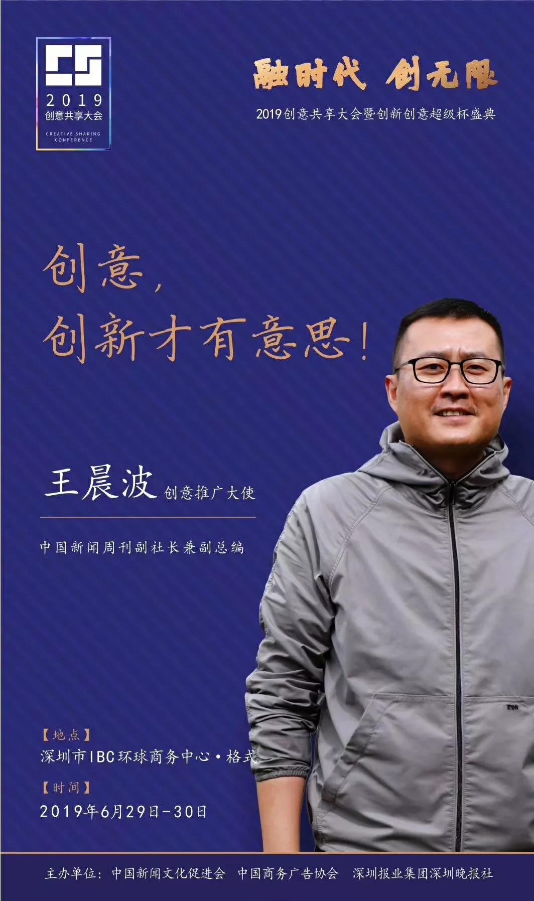 为了展现创意中国的精神风貌和创意传媒的文化力量,构建创新创意共同体,擘画美好图景和未来趋势,2019年6月29日至30日,由中国新闻文化促进会、中国商务广告协会、深圳报业集团深圳晚报社等联合主办的“融时代创无限——2019创意共享大会暨创新创意超级杯盛典”将在深圳市IBC环球商务中心隆重举办。