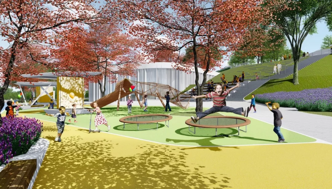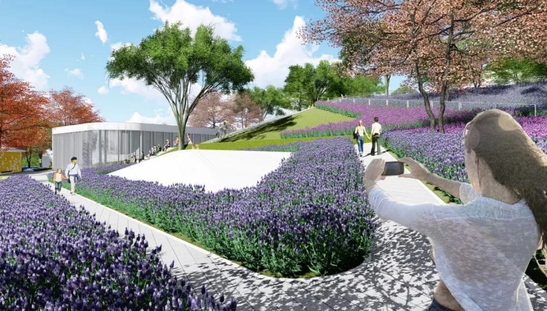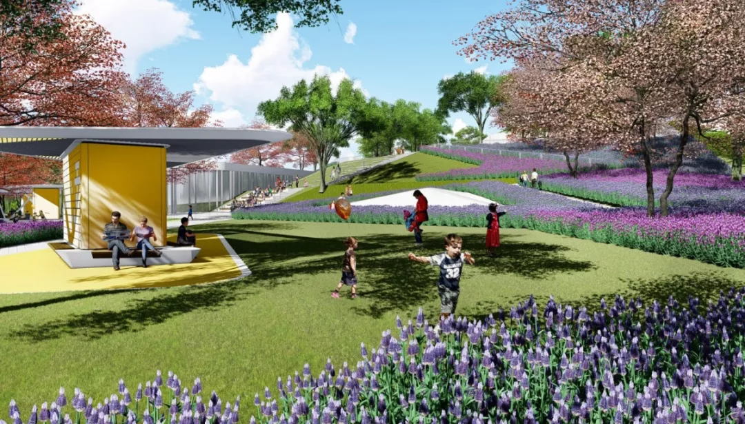 空中公园内围绕运动场的上空自然形成环形主动线。公园内绿植茂盛,通过植入多类型建筑景观空间元素,引发多种类型的活动体验:观景、慢跑、骑行、休闲、聚会、观看比赛、小型表演、体验农场、周末市集等等。