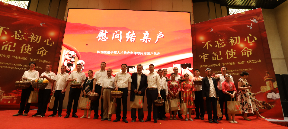 深圳新闻网2019年7月1日讯 盛夏七月,红色党旗迎风飘,为积极响应党中央关于在全党开展“不忘初心牢记使命”主题教育的重大部署。6月30日,深圳援疆前方指挥部、中共喀什市帕哈太克里乡委员会联合组织开展庆祝建党98周年暨“民族团结一家亲联谊”活动。喀什地区行署领导、全体援疆干部人才、帕哈太克里乡结亲群众等300余人参与活动。