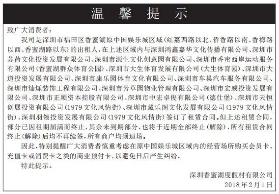 2018年2月1日,深圳香蜜湖度假村有限公司(原香蜜湖中国娱乐城区域的出租人)发布了所有商户均须退场的公告。