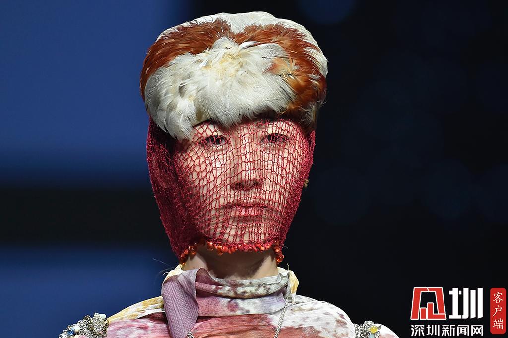 时装优秀学生组展示环节,一位模特以独特的造型亮相
