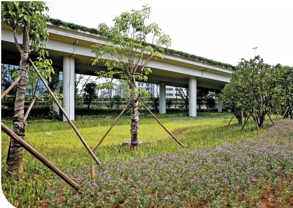 该工程将生态植草沟、生物滞留设施、溢流式雨水口、透水铺装、雨水检查井与自然生态、园林景观完美融合。