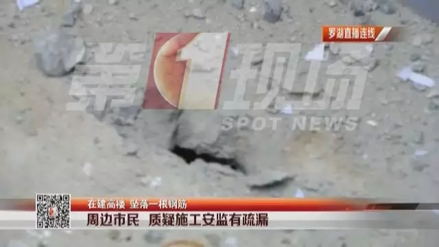 据目击者介绍,在罗湖帝豪金融大厦附近,一根建筑钢筋突然从高空坠落,砸在了路边,连水泥地面都被钢筋戳穿一个洞。