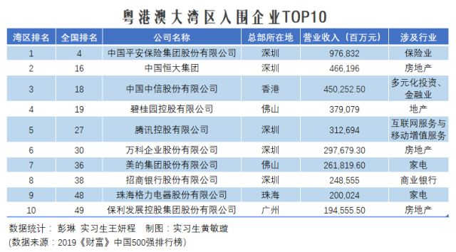 ④10日,2019年《财富》中国500强排行榜发布,考量了中国上市企业在过去一年的业绩。粤港澳大湾区有86家企业入围,占比近1/5。其中,最赚钱40家公司大湾区有12家,总部在深圳的企业最多,共有32家。