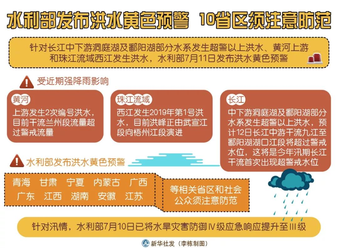 ⑨针对长江中下游洞庭湖及鄱阳湖部分水系发生超警以上洪水、黄河上游和珠江流域西江发生洪水,水利部发布洪水黄色预警,青海、甘肃、宁夏、内蒙古、广西、广东、江西、湖南、安徽、江苏等等10个相关省区和社会公众须注意防范。