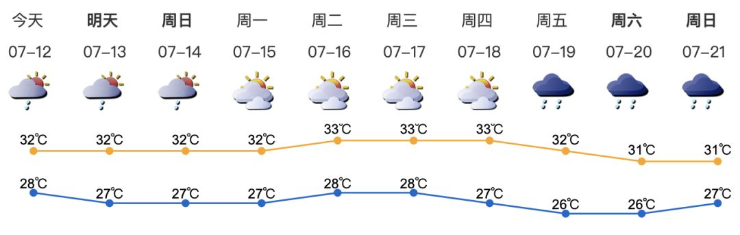 我市多云,有短时阵雨或雷阵雨;气温28-32℃;西南风3级;相对湿度70%-95%