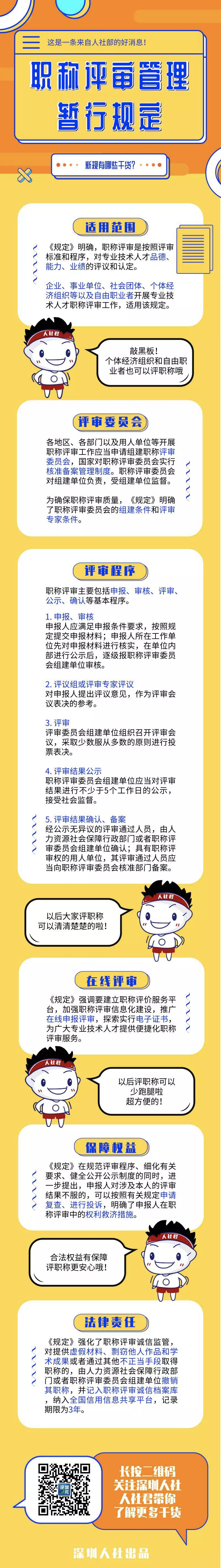 深圳特区报2019年7月12日讯 个体经济组织、自由职业者可以开展专业技术人才职称评审;推广在线评审,探索实行职称评审电子证书;不正当手段取得职称的,记入职称评审诚信档案库……7月11日,记者从深圳市人力资源和社会保障局获悉,《职称评审管理暂行规定》(以下简称《规定》)将于9月1日起施行,这是国家深化职称制度改革、加强职称评审管理、完善职称政策法规体系的一项重要举措。