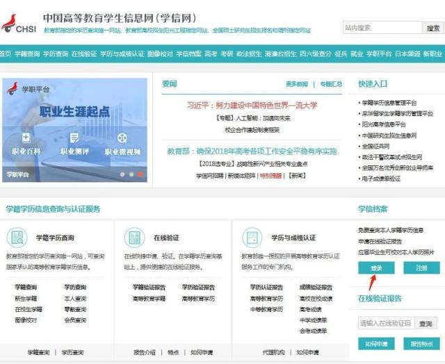 进入学信网网址:http://www.chsi.com.cn/,打开之后点击下图提示的地方
