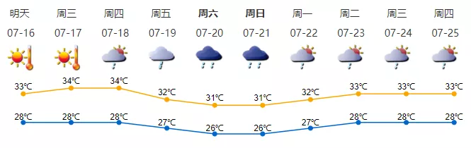 【深圳天气趋势】未来2-3天高温天气持续:16-17日天气炎热至酷热,偶有短时阵雨,最高气温33-35℃;18日天气炎热转雷雨;19-21日降雨增多,部分时间雨势较大。高温黄色预警生效中,请做好防暑降温、食品安全保障工作。