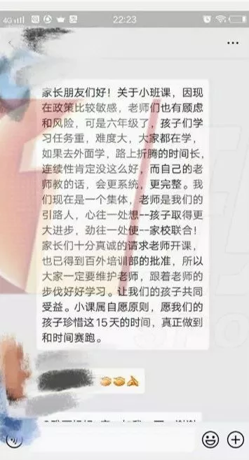 而这个所谓的小课,虽然名义上是“家长自愿”,但老师都放话了,玩得又是“群上接龙”这种“明牌游戏”,又有哪个家长敢公开不给老师面子呢?