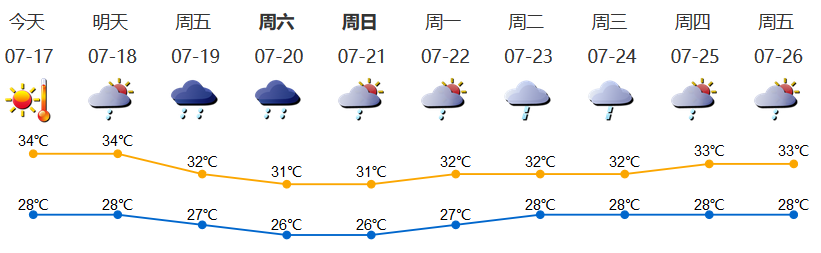 我市今天晴天间多云,天气酷热,部分时间有灰霾;气温28-34℃,中北部及人口密集区35℃或以上;南风转西北2级;相对湿度60%-90% 。