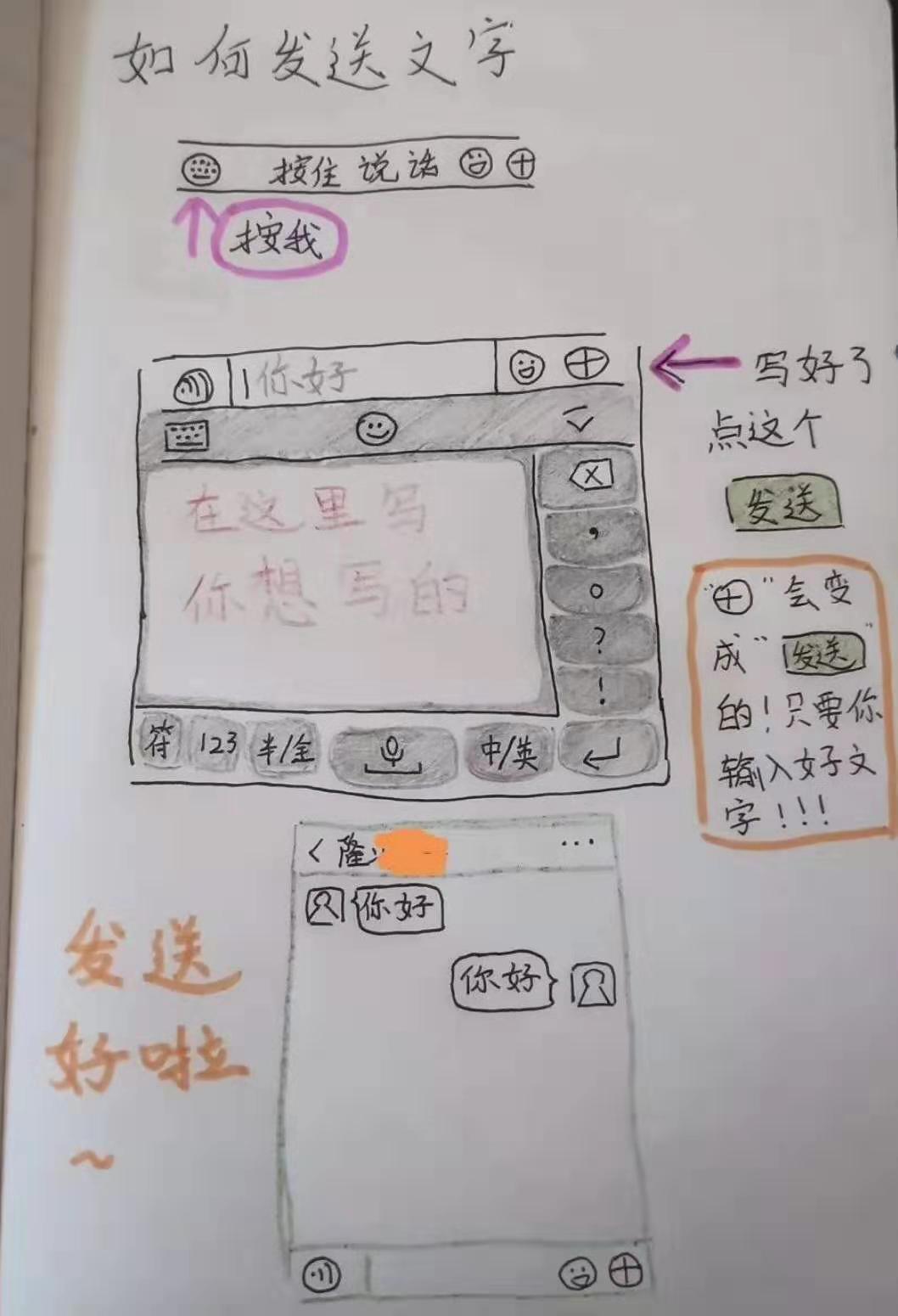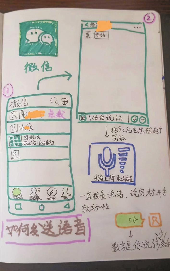 这是其侄女隆沂珊为了教会奶奶使用社交软件特别画的。图文并茂地记录了如何发送语音、如何发送文字等等,十分通俗易懂。