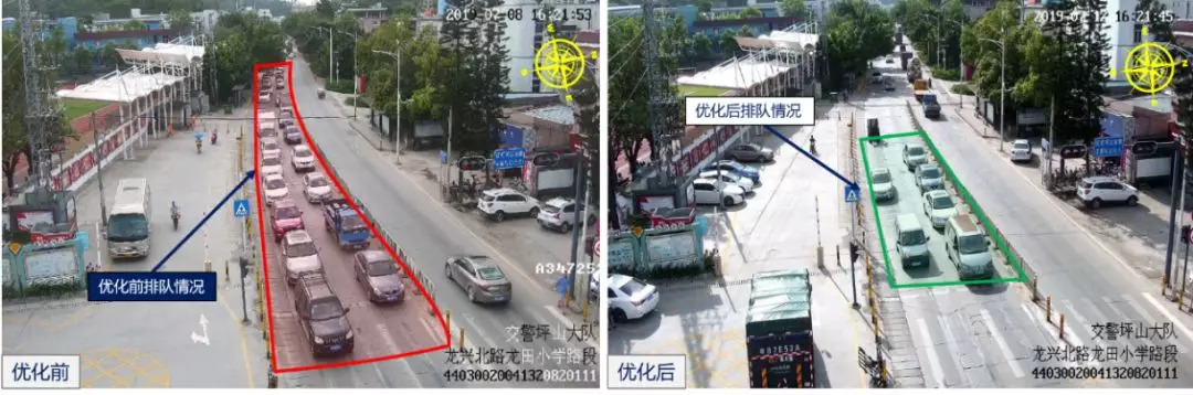 坪山龙兴北/龙田小学路口取消行人专用相位后,晚高峰南方向车辆排队长度由160米下降至30米,降幅81%,路口车辆排队问题明显缓解。