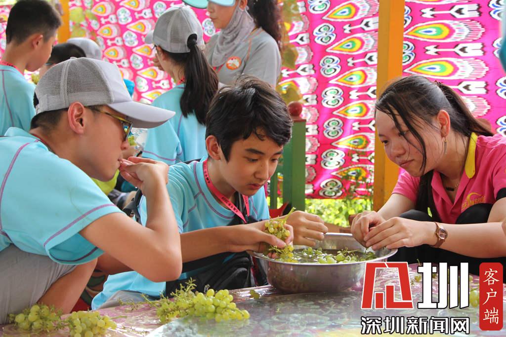学生们在葡萄沟景区里品尝葡萄。(深圳新闻网 记者吴梓欣 摄)