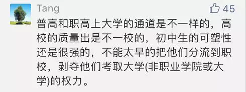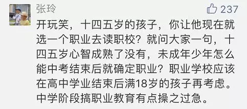 有网友表示:十四五岁的孩子行知尚未成熟,未成年少年无法在中考结束后就确定职业,职业学校应该在高中学业结束后满18岁的孩子再考虑。中学阶段搞职业教育有点操之过急。