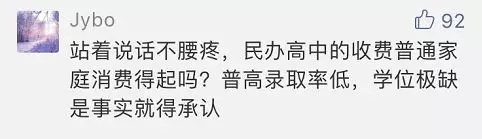 45.38%的公办普高录取率意味着有一半以上的学生上不了公办普高,只能求其次,选择职业学校和民办高中。虽然说教育没有高低之分,但是绝大多数家长都希望自己的孩子能够上公办普高,这也是竞争激烈的原因之一。为什么接受不了民办高中?除了担心办学质量问题,网友主要觉得民办学费贵。