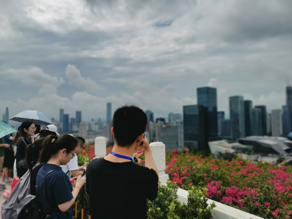 在莲花山公园山顶广场,远眺四周开阔无际、高楼林立的繁荣景象,采访团在拍照同时,纷纷感叹"深圳速度",深刻认识到改革开放是一条正确道路,坚信改革开放会带给人民更加幸福美好的新生活。