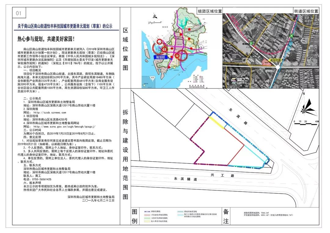 位于南山区南山街道,北接东滨路,南邻东滨隧道,东侧临南海大道。本单元规划容积26390平方米,其中产业研发用房18480平方米,产业配套用房6810平方米,公共服务设施(含地下)1100平方米。现该更新单元规划(草案)已经南山区城市更新工作领导小组会议审议。