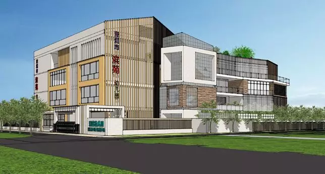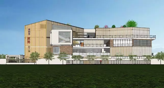 室外环境设有满足孩子们的橡胶跑道、人工草坪,大型娱乐滑梯设施等等,各层也设置了公共平台,为幼儿提供多样化的乐趣,满足幼儿好奇、好动、好模仿的特点。在屋顶设置了绿植与小型趣味玩具区,让幼儿接触自然,喜欢自然。