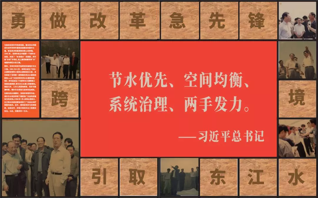 第二部分以“勇做改革急先锋跨境引取东江水”为题,通过1992年至2004年的东江水源工程规划报告及规划图、踏勘团队的工作影像等历史资料,体现深惠两地领导对工程的重视和工程规划的前瞻性。