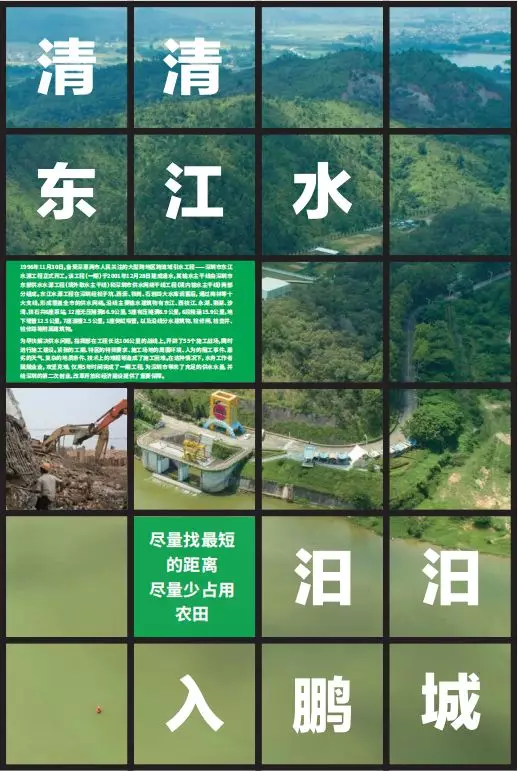第三部分“清清东江水汩汩入鹏城”,着重展示东江水源工程建设的全过程。以工程线路为展览线索,再现水务工作者在长达106公里的战线上奋战的场面。通过输水设施的新旧照片对比,描绘出一条在深惠两城平地崛起的深圳“生命线”。