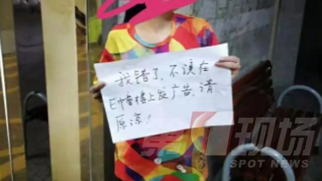 因为张贴的广告过多,处理起来繁琐且工作量很大,该名女子最后自己选择了对业主和住户们进行举牌道歉。