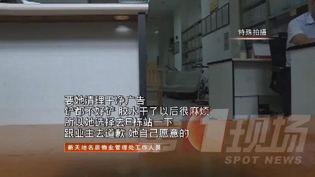 当时这名女子在小区E栋楼层里张贴小广告,物业发现后把她带到管理处,要求她自行清理掉自己张贴的所有广告,或者道歉,二者选其一。