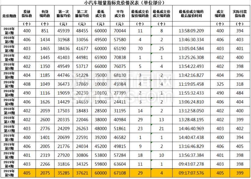 小汽车增量指标竞价情况表单位部分(2018年第一期——2019年第五期)