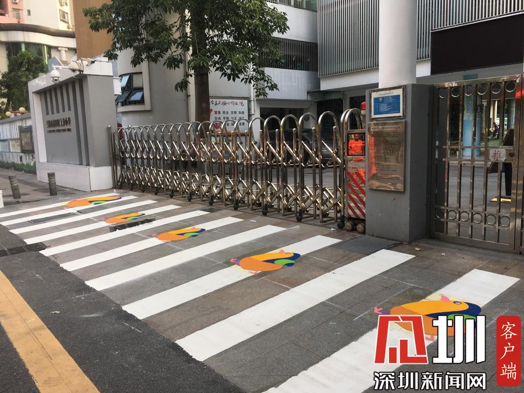 深圳试点儿童友好型交通设施,图为彩绘有企鹅的斑马线
