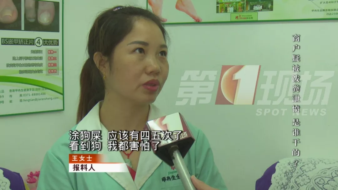 深广电第一现场2019年7月26日讯 市民王女士在深圳黄贝岭附近经营着一家治疗灰指甲的店,24日午夜时分,有一神秘人在她店门口泼了黄褐色的物体,让王女士现在看到狗都怕,到底发生了什么?这跟狗又有啥关系?