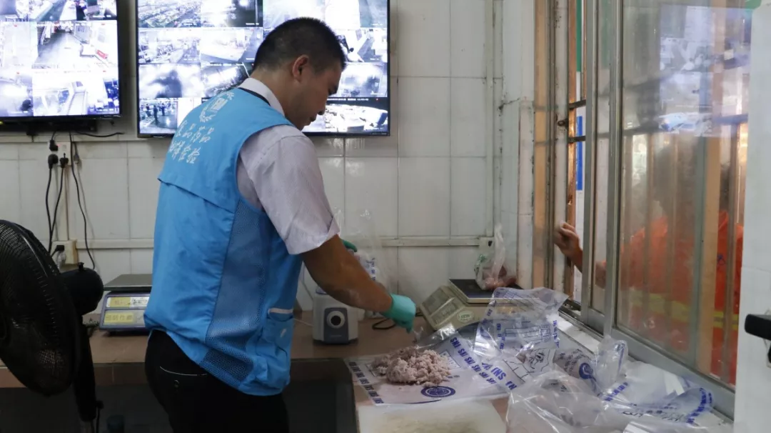 执法人员根据市场开办方提供的市场档位明细表,首先随机选取了市场内的肉档、水产品档、菜档,逐一进行检查,对档位的营业执照、台账建立情况检查无误后,执法人员又随机指定了检查品种,由快检人员现场开展快检工作。