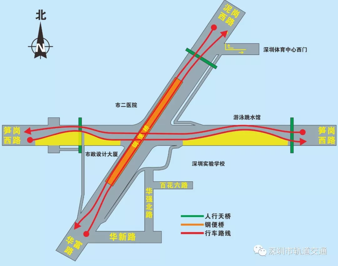 南北向:华富路—泥岗西路取消原通过平交路口的车道,转为通过上钢便桥实现自南向北通行;东西向:笋岗西路东西向直行交通保持不变,取消原平交路口的红绿灯。(详见图3)