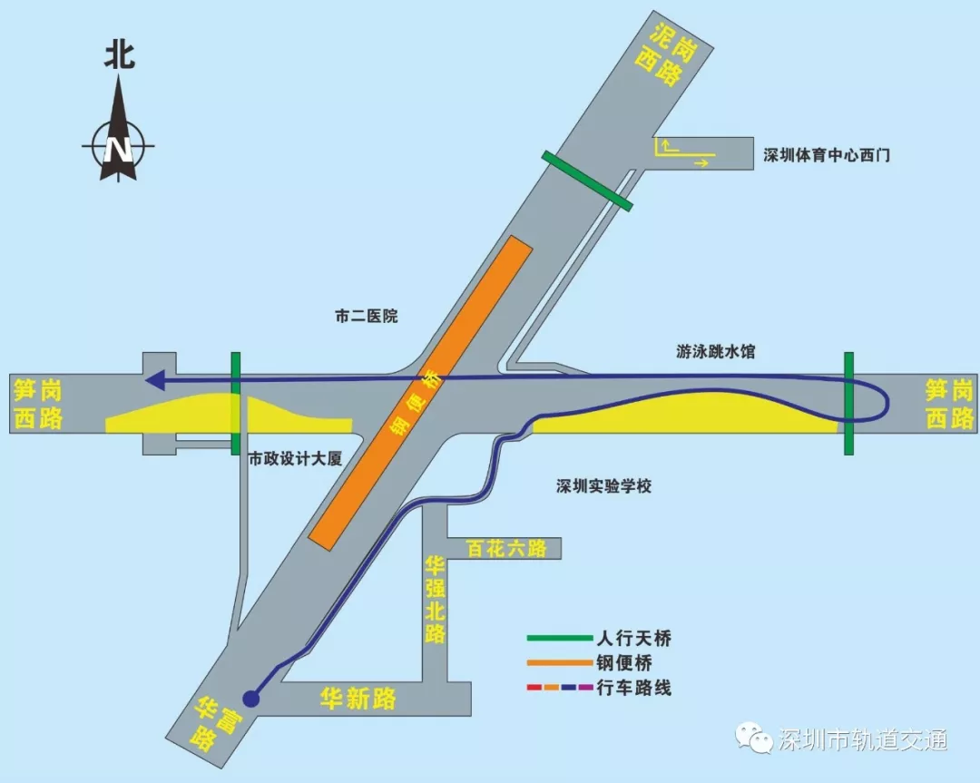 南转西(华富路左转笋岗西路):华富路通过右转辅道进入笋岗西路,随后在掉头口处掉头,直行通过原平交路口,完成左转。(详见图7)