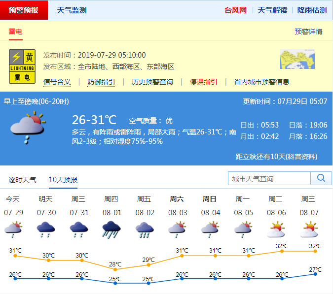 见圳客户端·深圳新闻网2019年7月29日讯 今天多云有雷阵雨,局部大雨;26-31℃;南风2-3级;湿度75%-95%。预计30-31日阴天间多云,有雷阵雨,局部暴雨;8月1日-2日有一次暴雨降雨过程;8月3日-5日降雨减弱,多云有阵雨或雷阵雨。