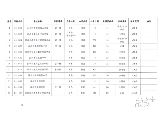 记者梳理发现,目前,深圳市共有16所普高尚有扩招及补录计划,补录人数2430人,最高补录分数线为377分。此外,全市还有4所中职学校与7所中技学校进行扩招与补录,补录人数共1367人,最高补录分数线为316分。