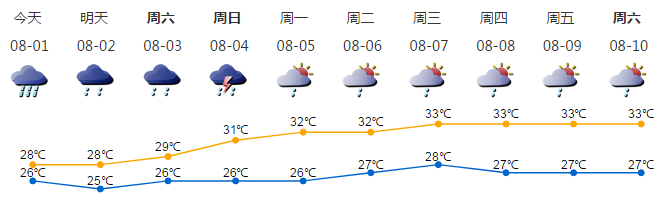 今日我市阴天,有间歇性强降雨,累计雨量可达暴雨;气温26-28℃;偏东风5-6级,阵风8-9级;相对湿度75%-100%