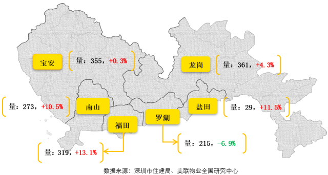 福田、南山、盐田三个区成交套数环比均出现超过1成的增长;而但从成交套数来看,罗湖区的成交量在全市中仅高于一直较低的盐田区。