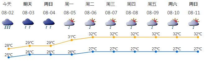 我市阴天,有间歇性强降雨,局部可达暴雨量级;气温25-28℃;东南风4-5级,阵风6-7级;相对湿度80%-100%