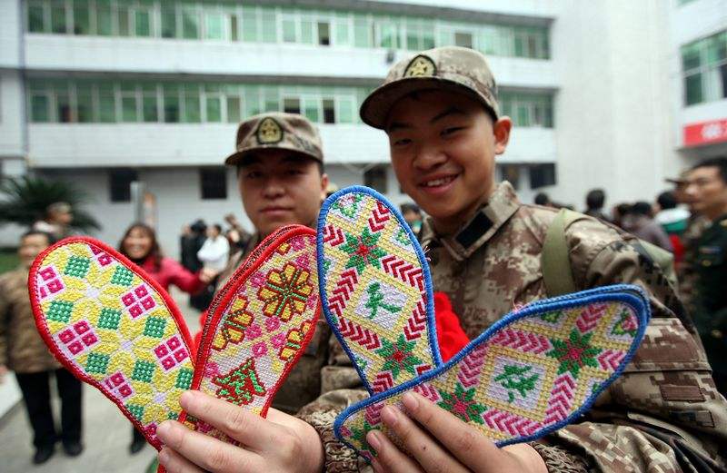 即将奔赴军营的新兵在展示“双拥鞋垫”