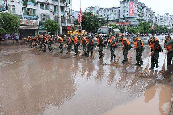 武警正在推移滨江路刚刚被特大洪水袭击产生的淤泥