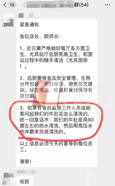 这张聊天截图显示:前晚7点54分,八合里的一个内部群,发出了一则紧急通知,要求店长、厨师长近期要做好餐厅各方面卫生,后厨要做好食品安全管理。如果有食药监局工作人员或顾客询问,牛肚是怎么清洗的,统一回复的话术是:我们的牛肚是用80度左右的热水清洗,然后用高压水枪冲磨来完成清洗的。
