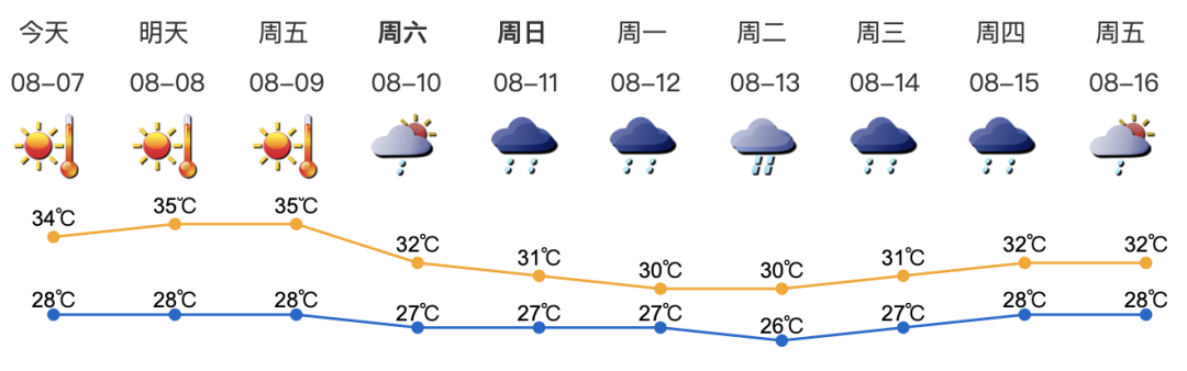 我市多云间晴天,局地有短时阵雨或雷阵雨,天气炎热;气温27-34℃,北部和人口密集区最高气温35℃或以上;东北风2级;相对湿度55%-80%